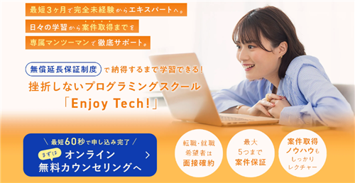 その中でも「Enjoy Tech!(エンジョイテック)」は、手厚いマンツーマンサポートと卒業後のキャリア保証を強みとし、市場において中価格帯から高価格帯に位置づけられるスクールです。